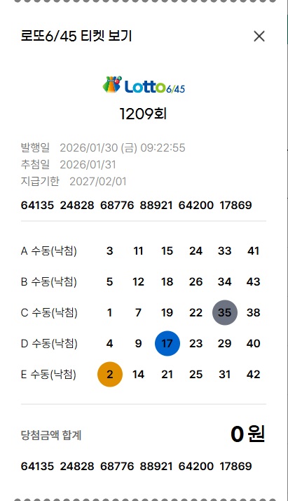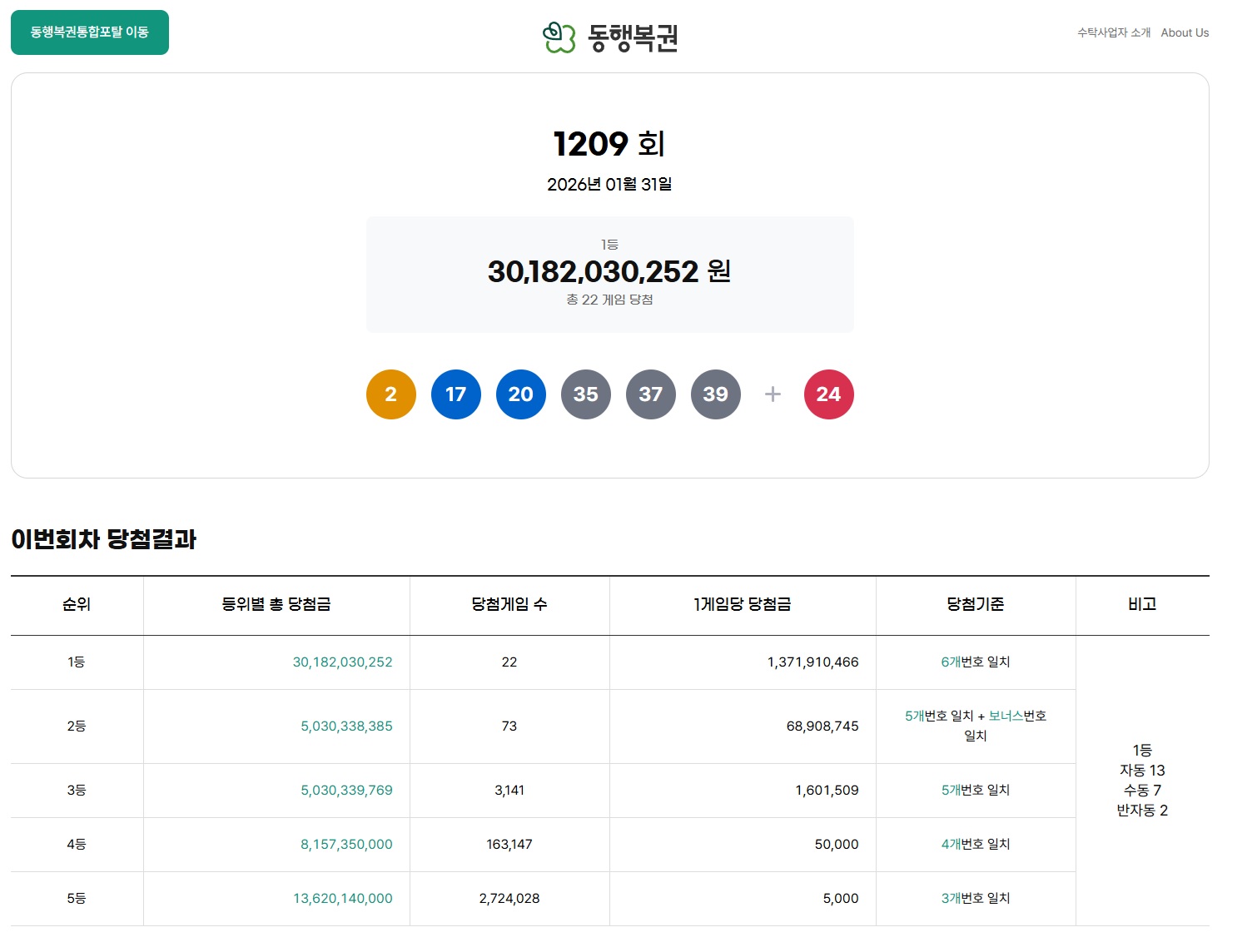 | 당첨 번호 | 2, 17, 20, 35, 37, 39 | 홀수 연번(35, 37, 39) 출현 |