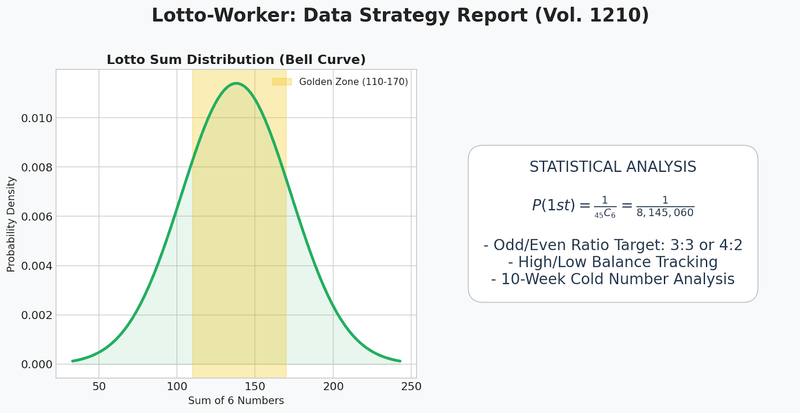 역대 당첨 번호의 합은 이론적 중앙값인 138을 중심으로 110~170 구간에 약 75% 이상 집중됩니다. 우리는 이 '골든 존'을 이탈하는 조합을 필터링하여 당첨 확률을 통계적으로 보정합니다.